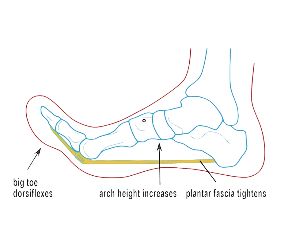 During the stance phase of gait, our toes dorsiflex to help raise the arch and provide greater shock absorption. As the arch flattens, the toes, plantar fascia, and associated muscles eccentrically contract via the windlass mechanism (Image 2.). This action helps spring the person forward with greater propulsion during push off. However, it only works when there’s decent big-toe mobility. With the feet acting as springs, absorbing and transferring the forces of gravity, it should be a remarkably efficient system, but that’s not always the case.