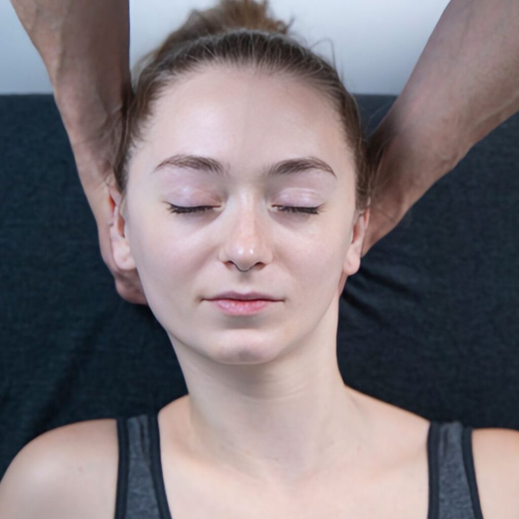 First, ask your client to move to the top of the therapy table so that you can grasp their head firmly with both hands. Warm up the tissue using your favorite neck techniques. Next, decompress the neck (Image 02) by grasping the client’s neck with both hands and leaning your body weight back to gently lengthen the neck, upper traps, and SCM.